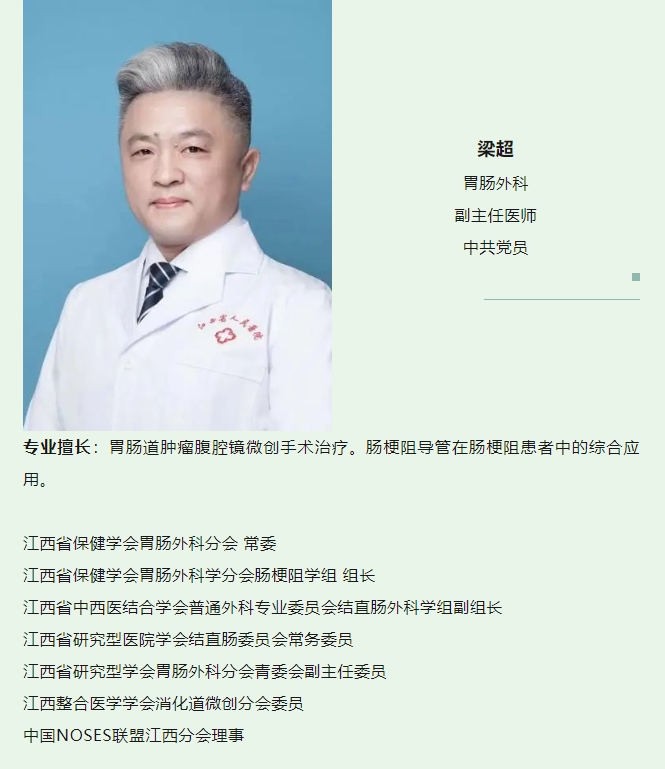 江西省人民医院复杂性肠梗阻诊治中心于2022年8月正式成立,挂靠胃肠外科。梁超副主任医师为肠梗阻学组组长,所领衔的治疗团队经验丰富,精益求精,培养了一批年轻优秀的人才。中心自成立以来,置管500余例,成功治疗了众多省内外复杂性肠梗阻患者,经鼻插入型肠梗阻导管置入术处于全省领先水平。置管时间仅为5-15分钟,成功率近100%,零并发症,避免部分患者二次手术,并为择期确定性手术创造了条件。特别是为腹部多次手术史后出现的肠梗阻、重大手术或外伤后麻痹性肠梗阻、腹腔结核、腹茧症、放疗后肠梗阻、晚期肿瘤合并肠梗阻等患者提供了有效的治疗手段。