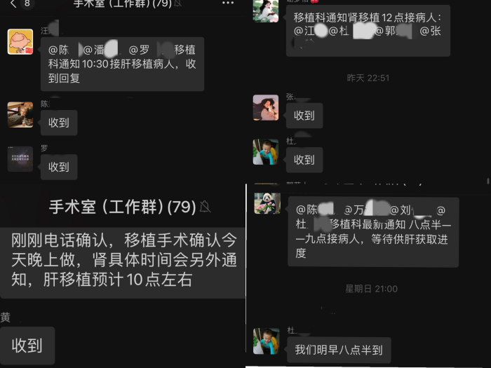 由于各种不确定的因素,肝肾移植手术无法提前选择手术时间。而器官从取下到植入能够保存的时间极短。所以,每一次的移植手术医护团队都在争分夺秒,确保每一个环节不浪费多余时间。所有参与移植手术的医护人员春节期间24小时待命,时刻关注手机里的通知,随时准备好进行器官移植手术。为了患者的生命健康,大家始终没有一句怨言,只要一个电话就会出现在手术室。