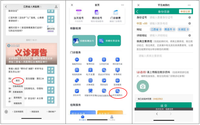 登录“江西省人民医院”微信公众号,点击进入“互联网医院”→“首页”→“罕见病预约”,在线填写病历资料,经诊治中心审核通过后电话通知患者就诊时间及就诊科室,患者就诊后,根据患者实际情况,制定单科诊治或罕见病多学科专家团队(MDT)诊治计划。