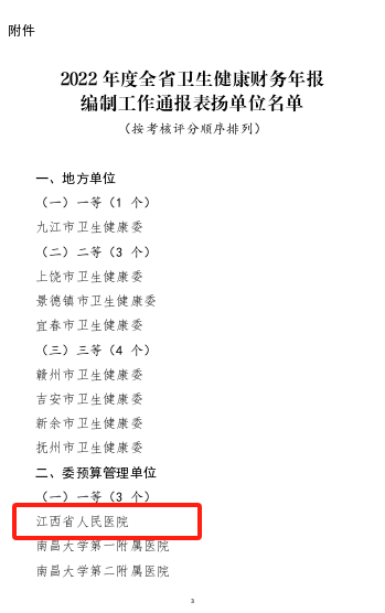 | 江西省人民医院获2022年度全省卫生健康财务年报编制工作一等奖 |