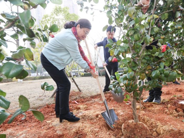 赣江之滨,春意渐浓。2024年3月12日是我国第46个植树节,省卫生健康委党组成员、省人民医院(南昌医学院第一附属医院)党委书记钭方芳,院党委副书记、院长陈志平及在家院领导来到江西省人民医院红谷滩院区,与江西省林业科学院张继红博士及志愿者一起参与植树节义务植树活动。