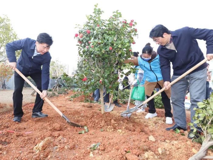 大家来到植树地点,戴上手套、拿起铁锹,团结协作,一派热火朝天的劳动景象。钭方芳、陈志平等分别与志愿者一起扶正树苗、挥锹铲土、填坑夯苗,每道工序一丝不苟、认真细致。在辛勤劳动下,一株株樟树、茶花球、茶花苗等新植树木被栽进沃土、迎风挺立,孕育着勃勃生机,焕发出绿色希望。