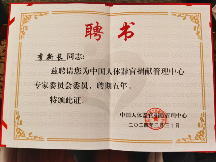 2024年3月31日,“生命·礼赞——2024全国人体器官捐献缅怀纪念暨宣传普及活动”在浙江举行。第十三届全国人大常委会副委员长、中国红十字会会长陈竺,国家卫生健康委员会党组副书记、副主任雷海潮,浙江省副省长、省红十字会会长李岩益,中国红十字会党组成员、副会长王平,中国红十字会副会长白岩松,中国科学院院士、中国人体器官捐献管理中心专家委员会主任委员陈孝平等出席活动。江西省人民医院(南昌医学院第一附属医院)器官移植科主任李新长主任医师当选中国人体器官捐献管理中心专家委员会委员。