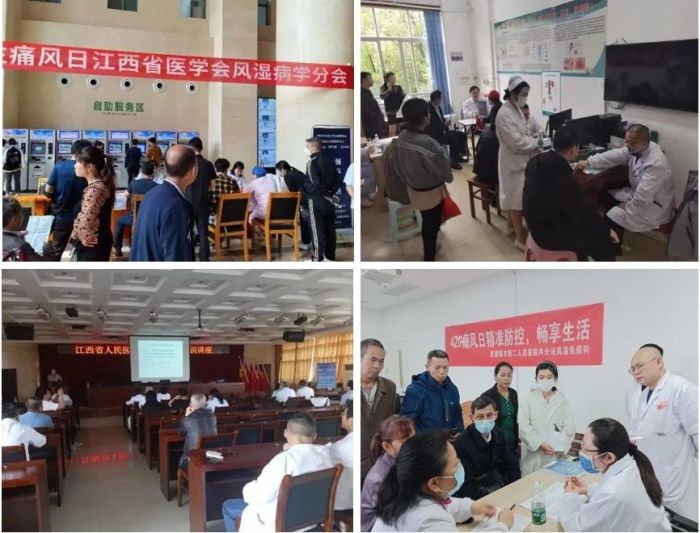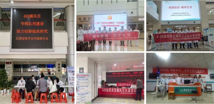 痛风是风湿免疫科最常见疾病之一,是急性心肌梗死和脑卒中的危险因素,可伴发肾脏、心血管及神经系统等多器官受累。随着生活方式的改变,不同国家和地区的患病率都呈现逐年上升的趋势。为提高全民对高尿酸血症及痛风的认知,进行科学管理,远离高尿酸血症和痛风对身体带来的损害,江西省人民医院(南昌医学院第一附属医院)风湿免疫科作为江西省医学会风湿病学分主委单位,组织“420痛风日”全省联动大型义诊科普活动。此次活动受到了各委员单位的积极响应,参与医院达到20余家,涉及各地的省、市、县三级医疗卫生机构,共服务数千人次,是一次覆盖面广、惠及群众多、社会影响力大的风湿病公益活动。