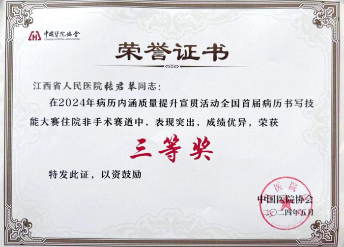 2024年05月11-12日,依据《2023年全国“百佳病案”评选活动方案》,全国首届病历书写技能大赛在北京举办。江西省人民医院(南昌医学院第一附属医院)重症医学科住院医师张君琴作为江西省代表队成员之一,夺得住院非手术赛道全国个人三等奖,也是我省本次参赛选手中唯一获奖选手。
