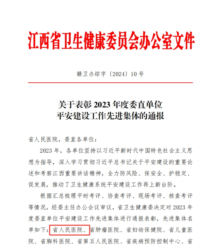 近日,江西省卫生健康委印发了《关于表彰2023年度委直单位平安建设工作先进集体的通报》,江西省人民医院(南昌医学院第一附属医院)获评2023年度委直单位平安建设工作“先进集体”荣誉称号。