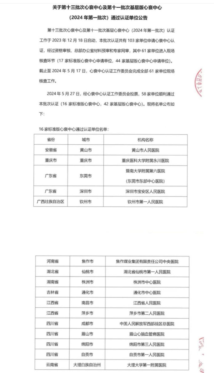 2024年5月27日,中国心衰中心总部发布《关于第十三批次心衰中心及第十一批次基层心衰中心(2024年第一批次)通过认证单位公告》。江西省人民医院(南昌医学院第一附属医)-省心血管病医院在各级领导及职能处室的支持下顺利通过国家标准版心衰中心认证。这标志着医院在提升心衰规范化诊疗水平的道路上又迈出了坚实的以及被肯定的一步。
