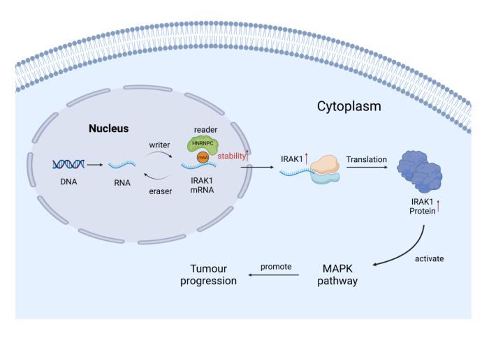 江西省人民医院老年医学研究所与江西省肿瘤医院国家卫健委鼻咽癌重点实验室研究团队合作,发现RNA甲基化修饰结合蛋白HNRNPC在胶质瘤中显著高表达,并与患者预后差密切相关;结合高通量测序手段,在体内、体外及临床水平均实证HNRNPC-IRAK1-MAPK信号轴在胶质瘤进展过程中发挥的重要作用,可作为改善患者预后的潜在治疗靶点。