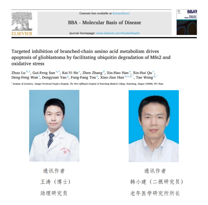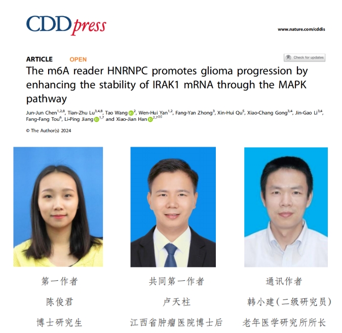 | 随着我国人口老龄化趋势增加,老年人群的健康问题已经成为国家和社会面临的重要挑战。恶性肿瘤是老年人常见的致死性疾病之一,其中胶质瘤是最常见、最具侵袭性的原发恶性脑肿瘤,约占颅内恶性肿瘤的70-80%。由于恶性胶质瘤与正常脑组织间缺乏明确界限,导致手术难以完全切除,单纯手术治疗复发率高,目前术后常联合放化疗,但复发风险仍居高不下,其2年生存率仅为30%左右。因此,深入研究胶质瘤的发生发展机制,可为其预防、诊断及治疗提供理论基础。江西省人民医院(南昌医学院第一附属医院)老年医学研究所聚焦于胶质瘤进展的分子机制及靶向治疗,开展了一系列研究,近日以韩小建所长为通讯作者在国际权威期刊《Cell Death & Disease》(中科院一区Top,影响因子9.0)和《Biochimica et Biophysica Acta (BBA) - Molecular Basis of Disease》(中科院二区Top,影响因子6.2)上发表了研究成果。