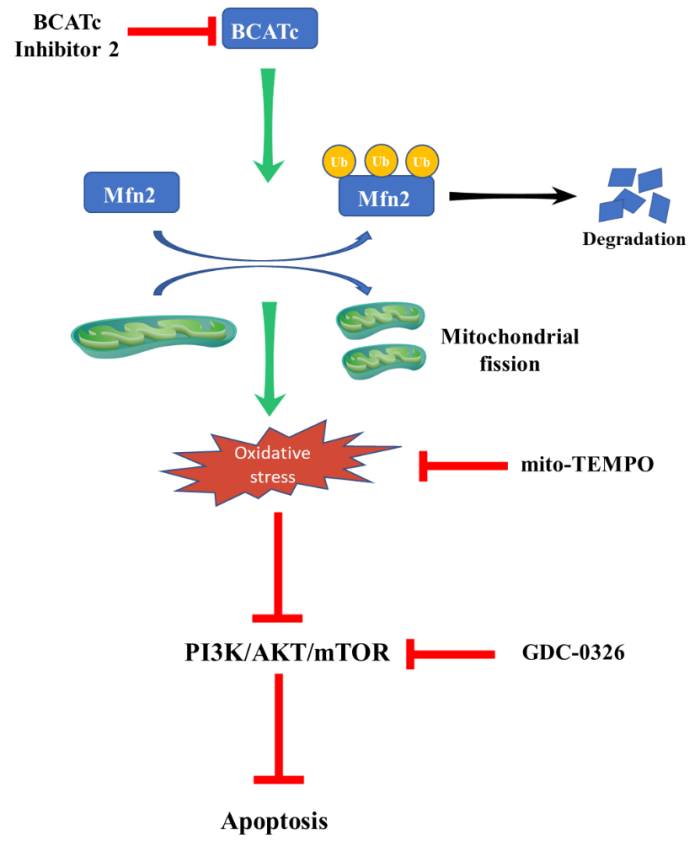 代谢重编程是肿瘤的重要特征,支链氨基酸代谢与胶质瘤的发生和发展密切相关。通过体内和体外实验,揭示了靶向抑制支链氨基酸代谢从而发挥抗胶质瘤作用的新机制:BCATc Inhibitor 2特异性抑制BCATc酶活性,可以促进线粒体融合蛋白Mfn2的泛素化降解;这一过程诱导了线粒体分裂和功能障碍,进一步通过PI3K/AKT/mTOR 信号通路诱导了细胞凋亡,从而显著抑制了胶质瘤的发展。该项技术同时已申请发明专利进行知识产权保护(专利申请号: 2023104544494 )。