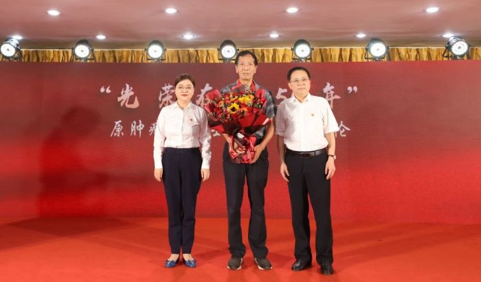表彰大会在庄严的国歌声中拉开序幕。在热烈的掌声中,江晓斌、钭方芳为原肿瘤科主任医师勾安伦同志颁发“光荣在党50年”纪念章。