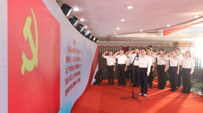 颁奖结束后,钭方芳带领新党员面向党旗庄严宣誓,老党员们也重温入党誓词。他们铿锵有力的誓言响彻整个会场,充分表达对党的忠诚与信仰。