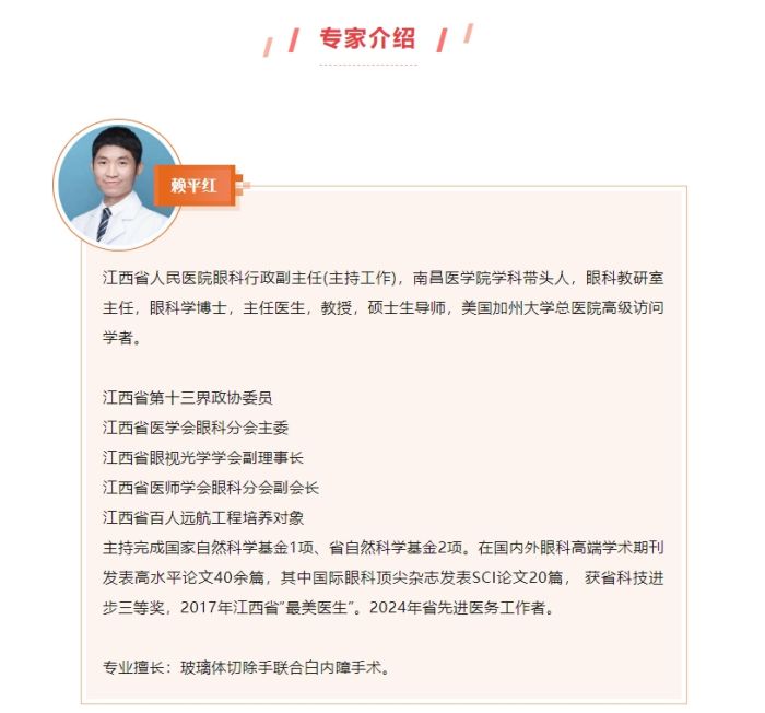 | 2024年7月27日,江西省医学会眼科学分会第十届委员会换届选举大会在昌举行,经换届会议选举,江西省人民医院(南昌医学院第一附属医院)眼科行政副主任(主持工作)赖平红当选江西省第十届眼科学分会专业委员会主任委员。