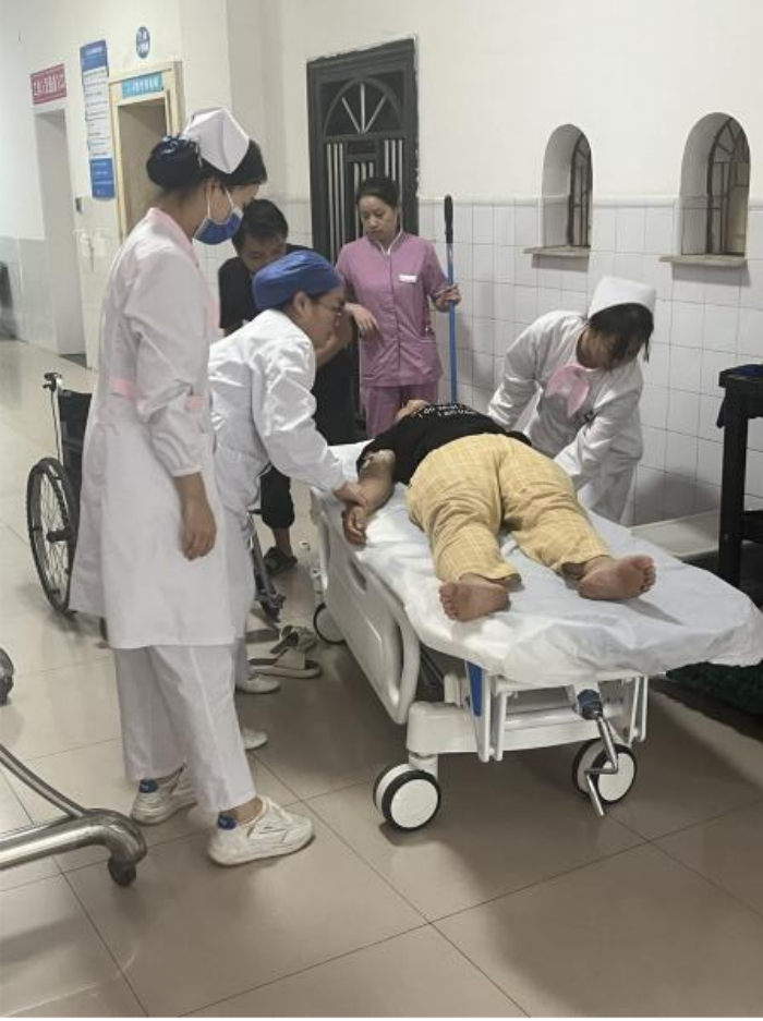 当天,门诊护理组护士罗旋跟往常一样在导诊台接待患者,按照患者疾病的轻重缓急及病种有序引导挂号就诊,同时回答病人及家属的各项问题。就在罗旋照常忙碌时,突然听见患者家属的呼救,罗璇立马循声跑去,向家属询问患者状况,得知其为本院住院患者,现在是在门诊做检查,检查期间突发抽搐。罗旋到达时患者正处于抽搐状态,双眼紧闭脸色苍白,抽搐状态了持续几秒钟,抽搐结束后患者意识清醒。罗旋快速跑向备用平车处,将患者合力抬上平车,这期间仅耗费十几秒。