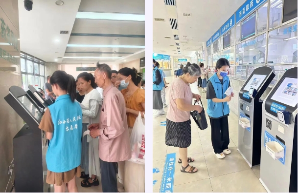 活动期间,医院的各个角落都能看到“蓝马甲天使”忙碌的身影。导诊台处,他们热情地为患者指引方向、解答疑问;自助挂号机旁,他们耐心指导患者操作;影像自助取片机和药房自助签到处,他们协助患者快速获取报告和签到取药,尽力确保患者的每个疑问都能及时得到答复。他们穿梭在医院的各个角落,用渺小的星火汇聚成强大的力量,传递省人民医院的关怀与温度。