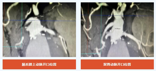 MDT讨论认为:患者腹主动脉瘤最大直径近8cm,有腹痛相关症状,且拒绝外科手术治疗,而腹主动脉腔内修复术(EVAR)具有住院时间短、创伤小、围术期并发症发生率和死亡率低等特点,是目前治疗腹主动脉瘤的主要方式。但患者的腹主动脉瘤瘤颈太短,且瘤体毗邻腹腔脏器重要血管,其中肠系膜上动脉开口距离瘤颈仅21mm,肠系膜上动脉开口距离右肾动脉开口仅12mm。如行常规的腹主动脉覆膜支架腔内隔绝术,则存在支架上缘无法精准定位的手术难点。一旦定位偏高,容易影响肠系膜上动脉、双肾动脉开口血流,造成肠坏死、肾梗死等致命性并发症;而一旦定位偏低,则容易造成腹主动脉瘤隔绝不充分、内漏等不良后果。
