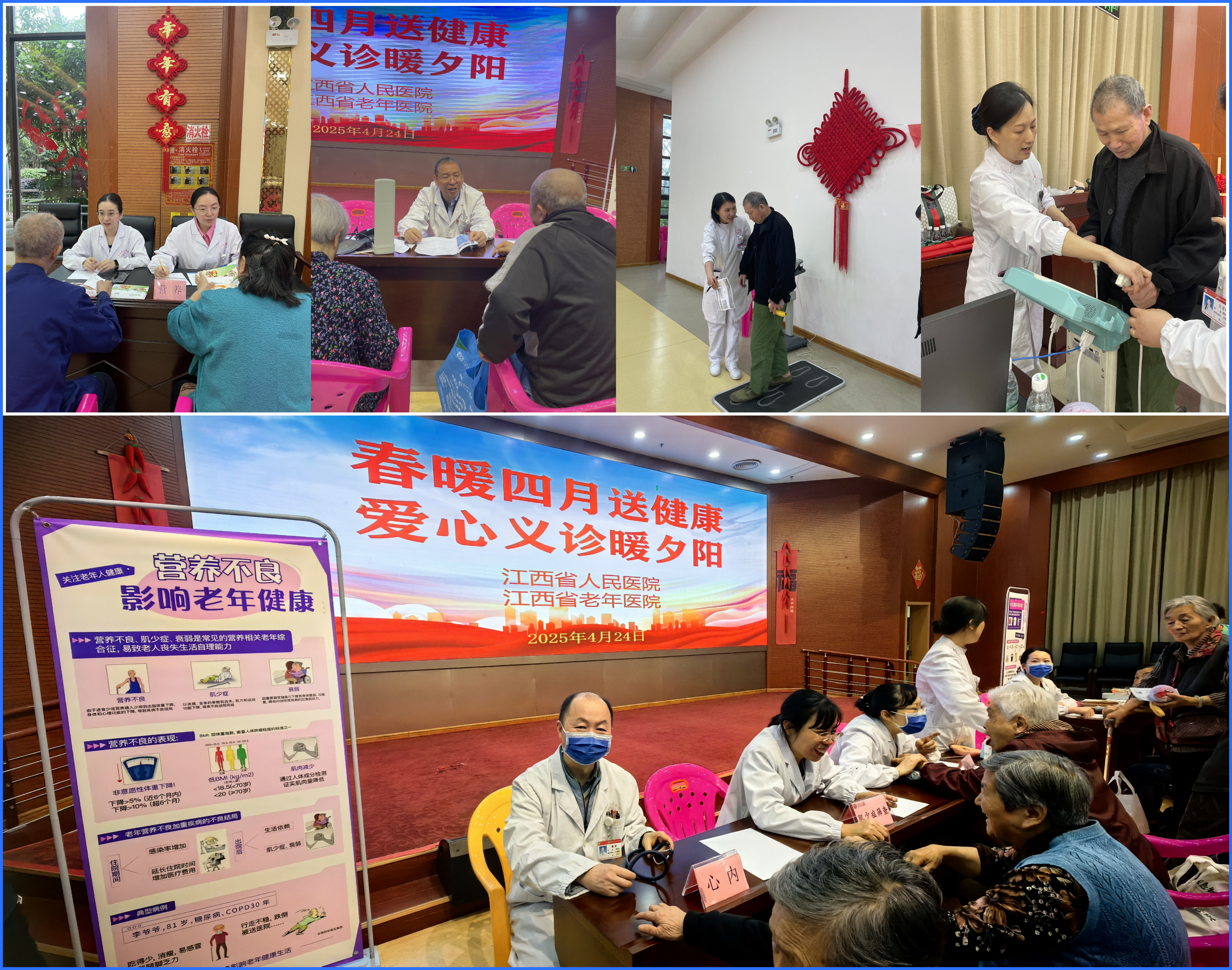 人间四月,春暖花开。为弘扬尊老敬老的传统美德,关爱老年人健康,响应国家关爱基层群众健康的号召,2025年4月24日上午,江西省人民医院(南昌医学院第一附属医院)-省老年医院组织专家团队,在一部病区主任胡坚的带领下,走进南昌市西湖区社会福利院,开展“春暖四月送健康,爱心义诊暖夕阳”主题义诊活动,为老年朋友送去温暖与健康关怀。