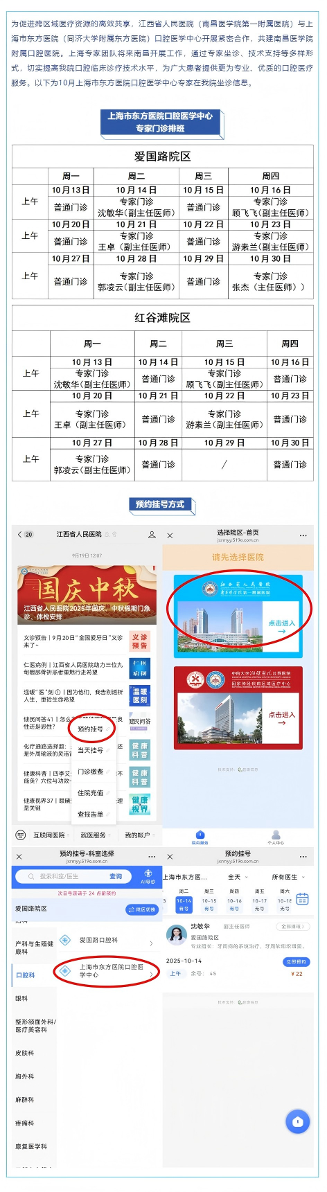 上海市东方医院口腔医学中心专家10月份在昌坐诊安排