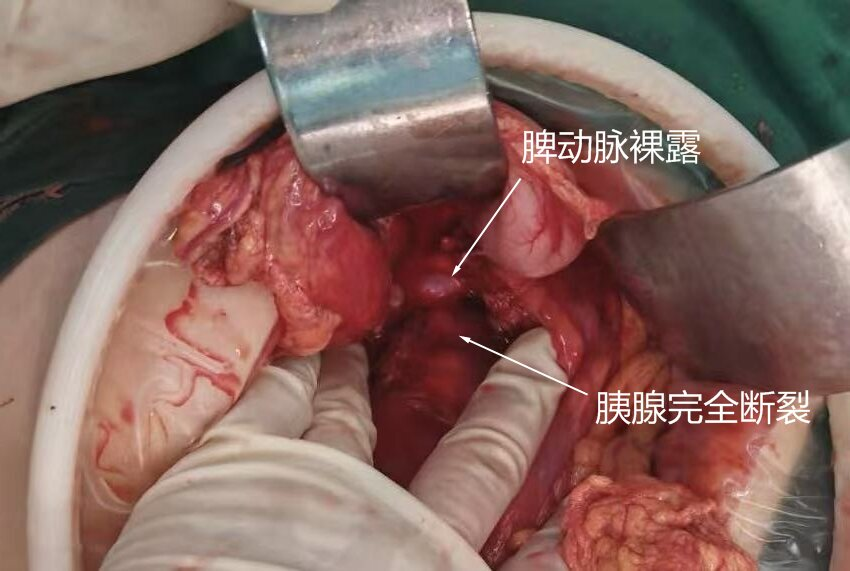 凌晨1点,手术室无影灯亮起,术中探查结果比预想更为严重: 胃部可见长达15cm×3cm的巨大破口,多处浆膜层撕裂; 肝脏裂伤长约3.5cm,深达2cm;脾脏严重破裂,裂口累及脾门,出血汹涌; 空肠起始段存在明显裂伤;最令人揪心的是,胰腺自胰颈处完全断裂,组织碎裂,解剖结构严重破坏。