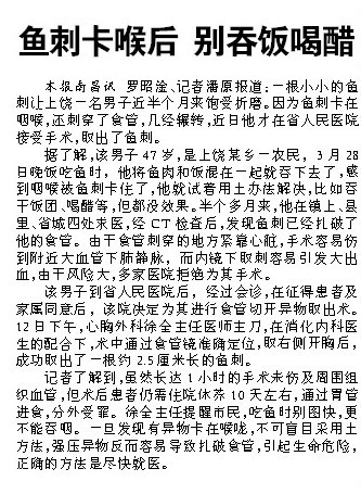《信息日报》鱼刺卡喉后 别吞饭喝醋