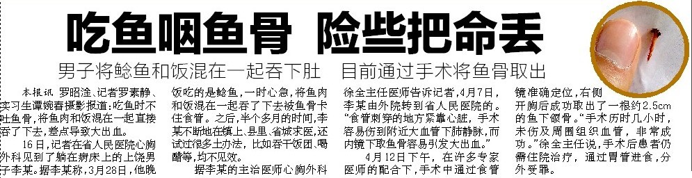 《江南都市报》吃鱼咽鱼骨 险些把命丢