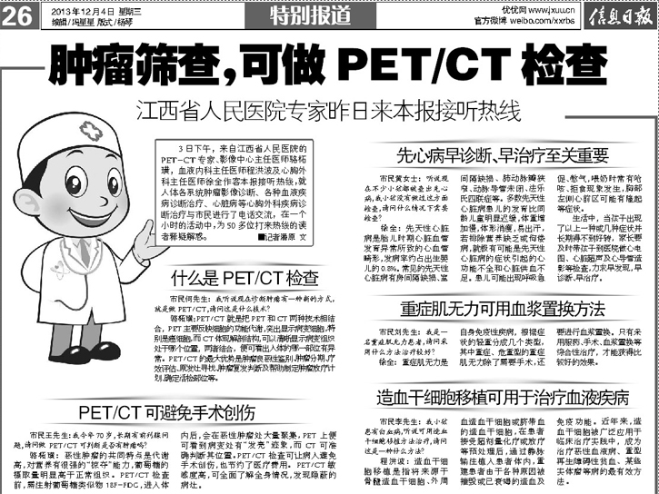《信息日报》肿瘤筛查,可做PET/CT检查