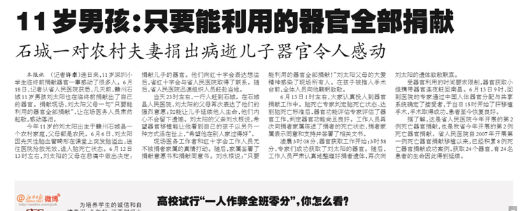 《江西日报》11岁男孩:只要能利用的器官全部捐献