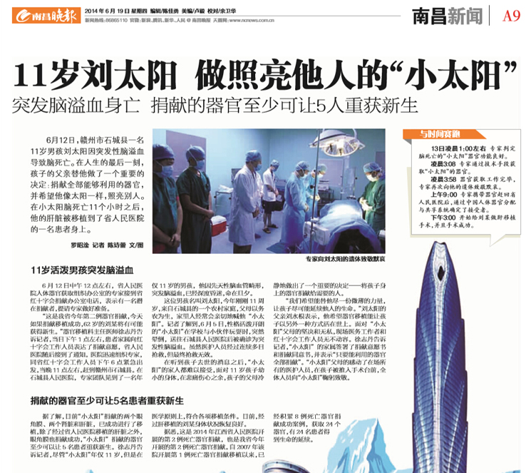 《南昌晚报》11岁刘太阳 做照亮他人的“小太阳”