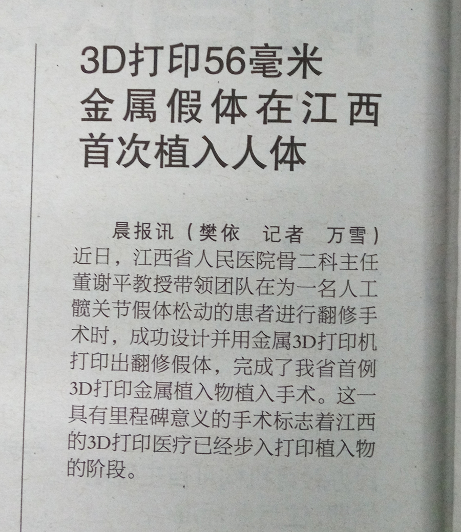 《江西晨报》3D打印56毫米金属假体在江西首次植入人体