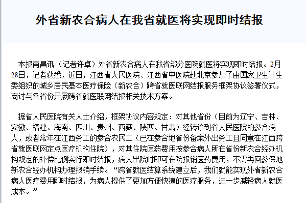 《江西日报》外省新农合病人在我省就医将实现即时结报