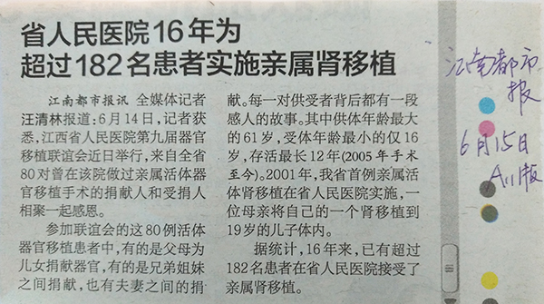 《江南都市报》省人民医院16年为超过182名患者实施亲属肾移植