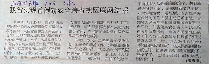 《江西卫生报》我省实现首例新农合跨省就医联网结报