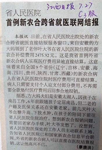 《江西日报》省人民医院首例新农合跨省就医联网结报