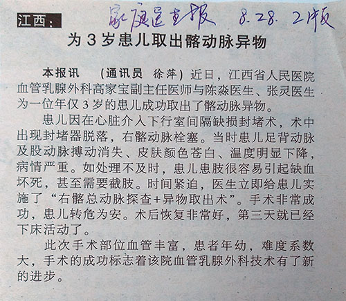 《家庭医生报》为3岁患儿取出髂动脉异物