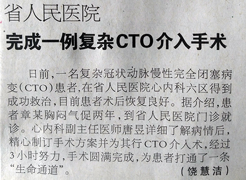 《江西日报》省人民医院完成一例复杂CTO介入手术