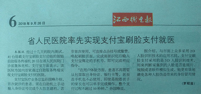 《江西卫生报》省人民医院率先实现支付宝刷脸支付就医