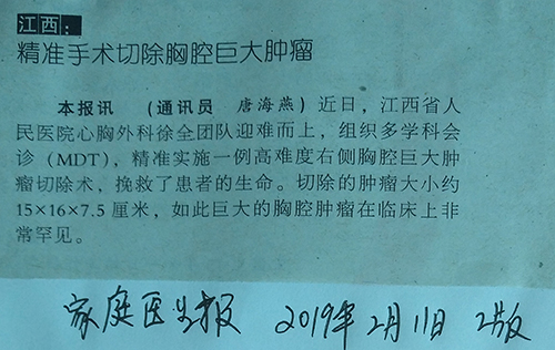 《家庭医生报》精准手术切除胸腔巨大肿瘤
