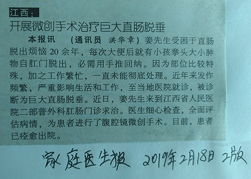《家庭医生报》开展微创手术治疗巨大直肠脱垂