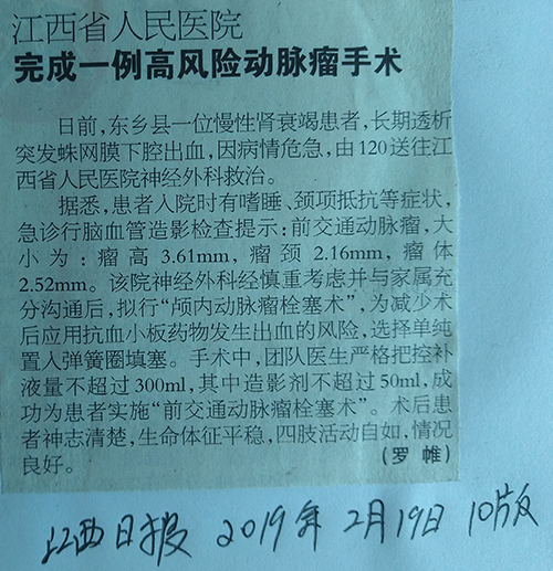 《江西日报》江西省人民医院完成一例高风险动脉瘤手术