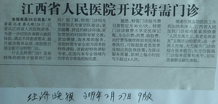 《经济晚报》江西省人民医院开设特需门诊
