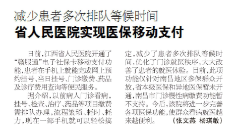 《江西日报》减少患者多次排队等候时间 省人民医院实现医保移动支付