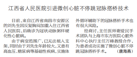 《健康报》:江西省人民医院引进微创心脏不停跳冠脉搭桥技术