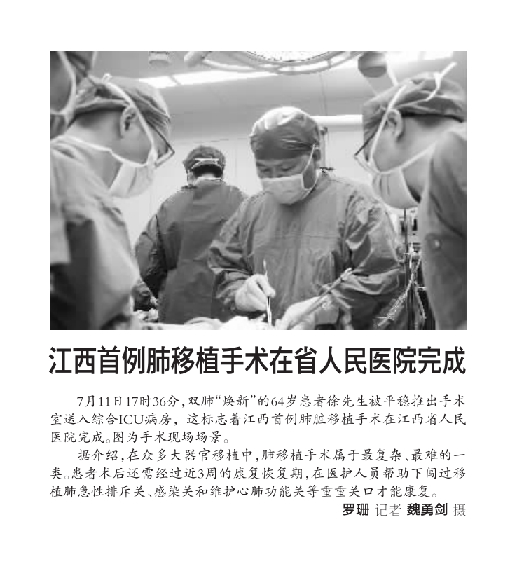 《南昌日报》:江西首例肺移植手术在省人民医院完成