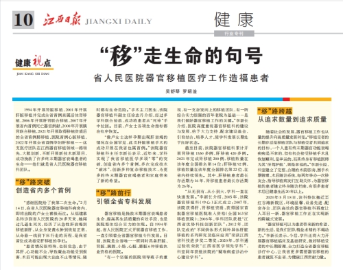 “从无到有,从小到大,学科一直在快速发展。”李新长介绍,2005年,该院器官移植科(中心)正式成立;2007年,该院获得肝、肾移植资质,获得国家首批器官移植医院准入资格(全国163家移植医院);2008年,学科团队获批“江西省优势科技创新团队”;2012年,团队完成的“不同供体形式同种异体肝脏移植的系列研究及临床应用”荣获江西省科技进步奖二等奖;2020年,学科通过验收荣获“江西省医学领先学科”,科室同年获批该院的“疑难病症诊治中心建设学科”。