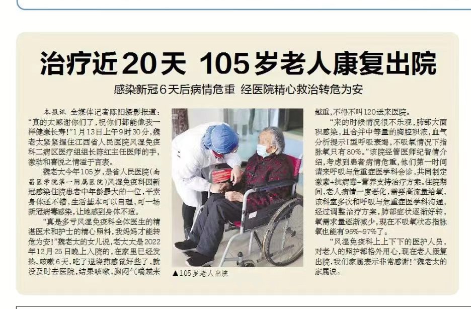 《江南都市报》:治疗近20天 105岁老人康复出院