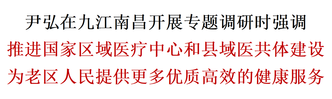 7月8日,省委书记尹弘深入九江、南昌,专题调研国家区域医疗中心和县域医共体建设情况,并看望慰问高温一线医护人员。他强调,要深入贯彻习近平总书记关于卫生健康工作的重要论述,坚持以人民为中心的发展思想,科学编制“十五五”卫生健康发展规划,高质量推进国家区域医疗中心和紧密型县域医共体建设,努力为老区人民提供更多优质高效的健康服务。