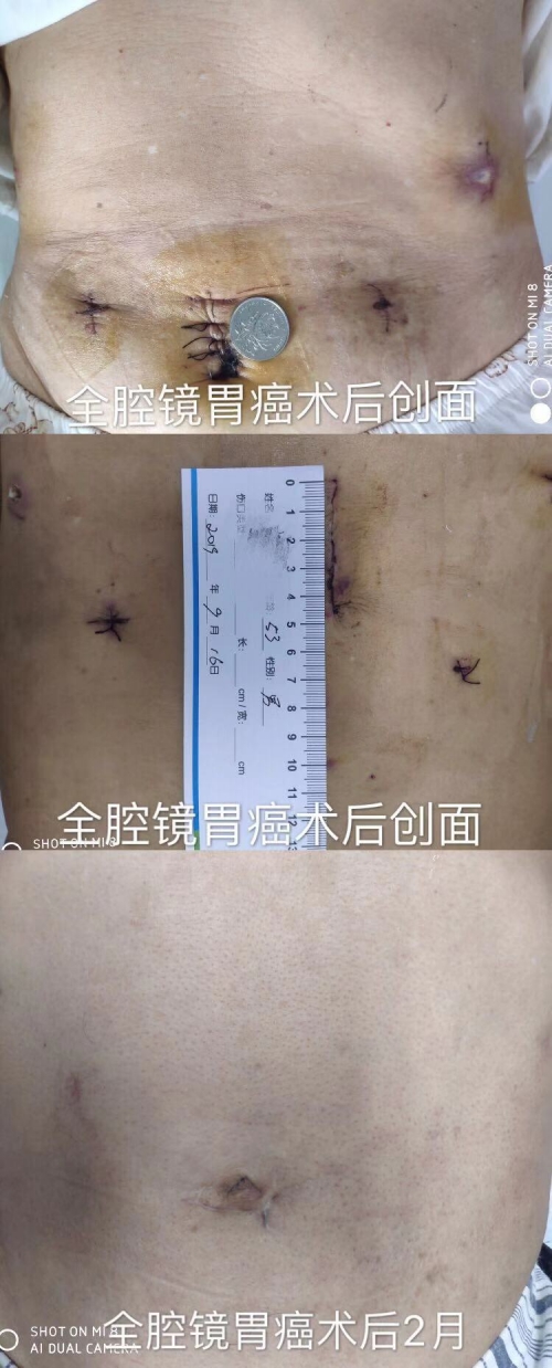 面对患者的诉求,胃肠外科廖传文团队在完善术前相关检查后,组织了肿瘤科、肾内科、麻醉科等多学科讨论,针对该患者病情及意愿制定了缜密的微创手术治疗计划,经充分的术前评估及准备,由廖传文团队为其实施了3D全腔镜下胃癌根治术。术后患者康复顺利,于术后2天下床活动并行血液透析,术后3天肠功能恢复,第4天进食流汁,术后6天拔除腹腔引流管,术后8天痊愈出院。患者及其家属对整个治疗过程及疗效非常满意。
