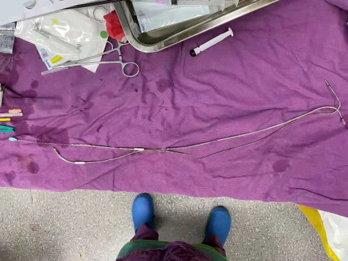 考虑患者经济困难,经省心血管病医院洪浪院长、王洪副院长、刘元庆副主任医师、柴育亮和刘强主治医师反复研究病情,考虑患者起搏器已经植入5年,电极与腔静脉及瓣环粘连,决定先徒手经上腔静脉拔除电极,拔除困难情况下再采用经下腔静脉用圈套器加用面条导丝抓捕电极的新技术。该技术可增加手术成功率,明显降低手术费用。2021年4月13下午5时,手术在临时起搏器保护下开始,历经2小时,成功为患者拔除电极,手术过程顺利。手术费用才不到1万元!为患者节省了手术费近6万。术后叶先生感叹:省医医术高超,心系患者;服务贴心,手到病除。