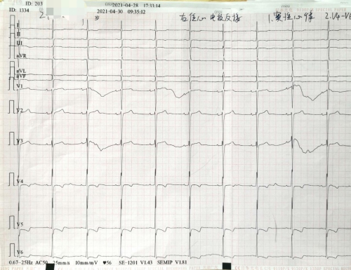 入院后,经管医生刘燕锋博士询问病史的同时,安排了心血管规培医生做心电图检查,心电图打印出来后,规培医生很惊讶,立即请教刘燕锋老师:这个病人的心电图很奇怪,是怎么回事呢?刘燕锋看过后交代他将心电图所有的导联反着接,再做一次看,规培医生马上反应过来了:这是一位特殊的右位心患者。