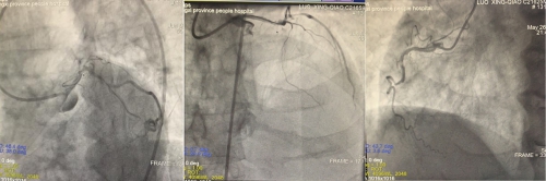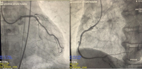 6月4日,在省心血管病医院院长洪浪的指导下,李林锋团队为患者进行了介入治疗手术。正如预计的一样,介入导丝通过“罪犯”血管左主干回旋支,患者就出现血压、心率下降,立即给予多巴胺升压,阿托品提升心率,IABP支持,经导丝快速送入球囊扩张病变,恢复血流,待患者生命体征平稳后,快速行回旋支-左主干支架植入术,手术惊心动魄,就像钢丝上的行走。做好了回旋支至左主干病变后,尝试开通前降支失败,是否要去尝试一下右冠呢?再次征求了患者及家属意见,为了远期预后,希望开通右冠脉闭塞病变,患者的信任和希望,再次给了手术团队的信心,手术团队在不到1小时内成功处理好了右冠闭塞病变。